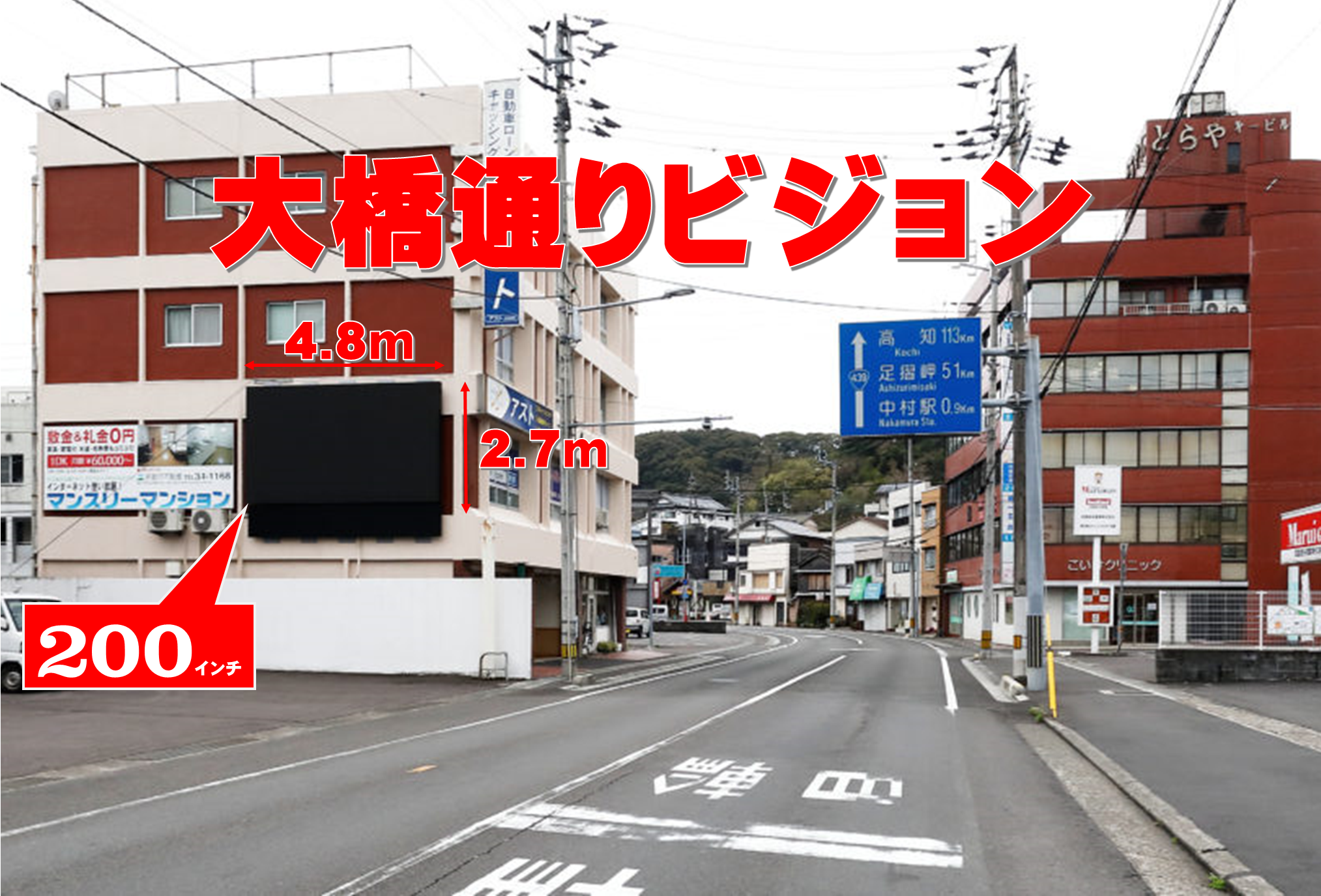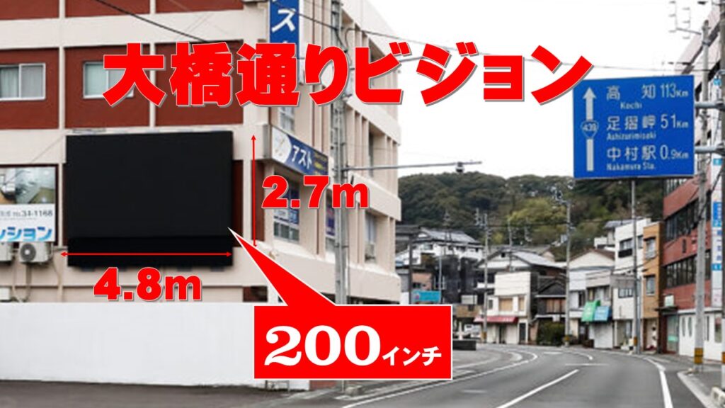 四万十市大橋通り6丁目の交差点に設置された200インチの屋外LEDディスプレイを使った広告スペースを募集しています!