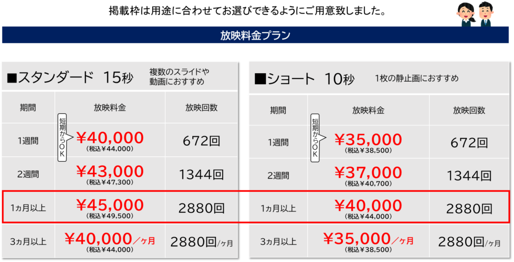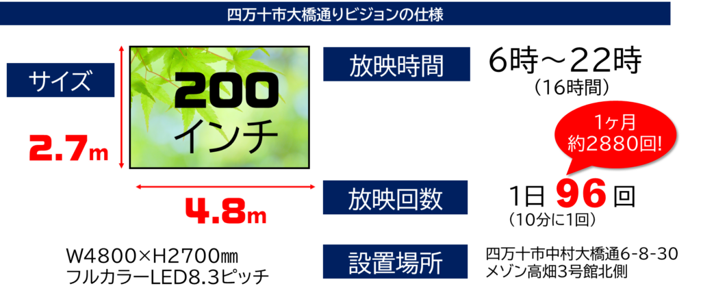 • 放映頻度:1日に96回(10分ごと)、月に約2880回
